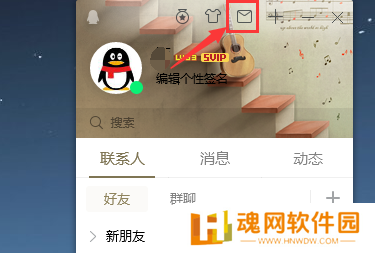 2、在QQ窗口右上角点击像信封一样的图标。如下图所示: