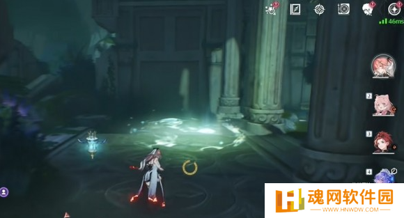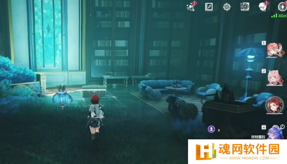 10、沿着左侧楼梯向上,站在发光点处切换场景,并进行交互。